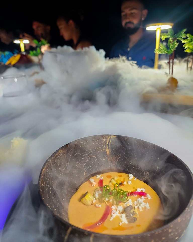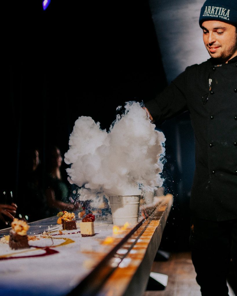 The snowman dances. Tubes squeeze. Foams explode. The table is literally on fire. You’ll eat sticky sauces from the table and sip what can only be described as silky snow. It’s like Willy Wonka met Game of Thrones and brought dessert.
